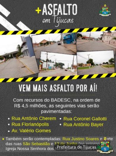 Tijucas vai ganhar mais obras de pavimentação asfáltica em breve. Ao todo, são oito importantes ruas que irão receber a melhoria com recursos provenientes da Agência de Fomento de Santa Catarina S.A. (BADESC) no total de R$ 4,5 milhões. As obras já estão sendo licitadas e devem ser iniciadas entre este mês e o mês de maio. É importante ressaltar que, em todas as obras licitadas, um eficiente sistema de drenagem será implantado para evitar alagamentos e dar maior durabilidade ao pavimento.
