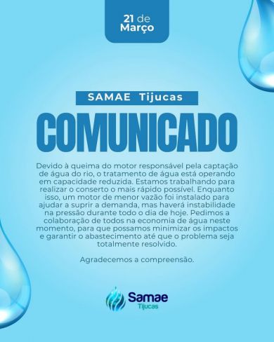 O Samae de Tijucas informou, no final da tarde desta sexta-feira, 21 de março, que o município deve enfrentar instabilidades no fornecimento de água. A falha ocorreu devido à queima do motor responsável pela captação de água do rio, o que resultou na redução da capacidade de tratamento.