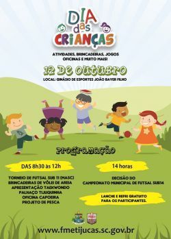 A Administração Municipal de Tijucas, por meio da Secretaria de Ação Social e Direitos Humanos e da Fundação Municipal de Esportes (FME), vai realizar neste sábado, dia 12 de outubro, uma programação diferenciada para comemorar o Dia das Crianças.