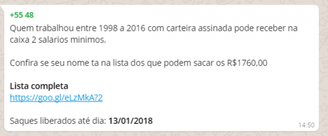 Voltou a circular no WhatsApp e em redes sociais nos últimos dias um boato segundo o qual aqueles que tenham trabalhado com carteira assinada entre 1998 e 2016 têm direito a receber, retroativamente, o valor de até dois salários mínimos:
