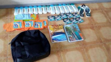 Foram encontrados dentro da bolsa 14 frascos de protetor solar, 05 flanelas, um pano microfibras, 08 giletes de barbear, um par de chinelos e 02 cadernos universitários.