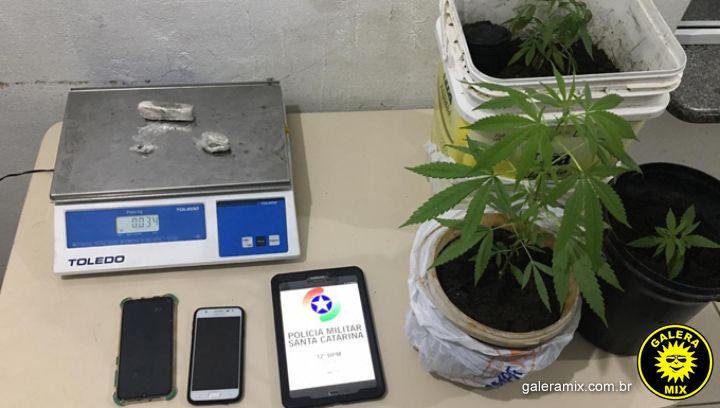 Em buscas na residência foram localizados três pés de maconha e mais 34 gramas da droga já embaladas para consumo.