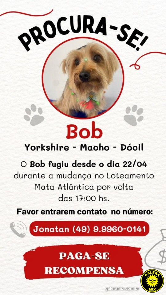 Jonatan se mudou para a cidade de Tijucas nesta segunda-feira, 22 de abril, e seu cãozinho, um yorkshire macho de 3 anos, acabou fugindo.