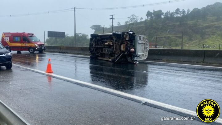 Uma van tombou após colidir contra o guard-rail, durante a tarde desta segunda-feira, 19 de dezembro, em Tijucas. O acidente ocorreu na rodovia BR-101, a poucos metros do acesso ao bairro Morretes, na pista do sentido Sul.