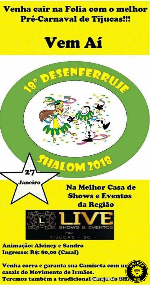 Neste sábado (27), acontece a edição 2018 do Desenferruje, tradicional baile de casal de carnaval, que este ano será realizado na Live Shows e Eventos em Tijucas. E quem vai curtir esta super festa por conta do Galera Mix é: