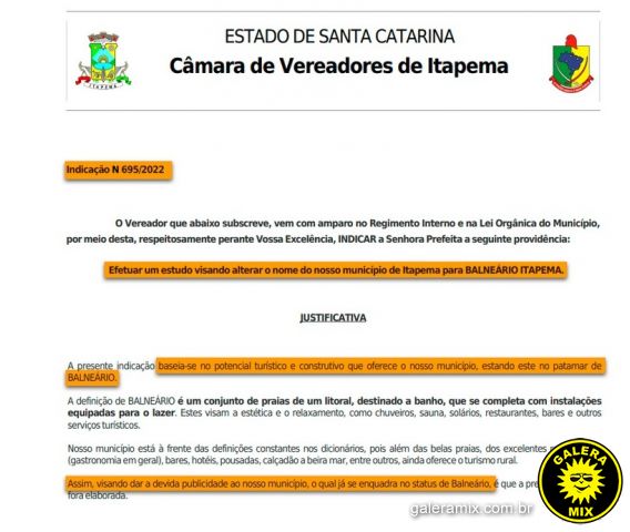 Ela protocolou uma indicação para que o nome de Itapema seja mudado e a cidade passe a se chamar Balneário Itapema.