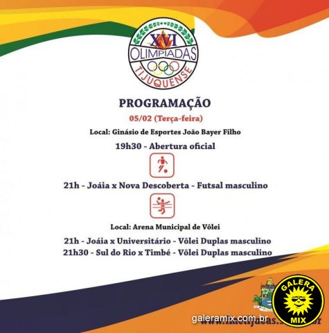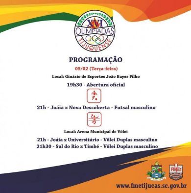 A 16ª Edição das Olimpíadas Tijuquense Interbairros começa oficialmente na noite desta terça-feira, 05. A cerimônia de abertura acontece a partir das 19h30, no Ginásio de Esportes João Bayer Filho. A tradicional competição realizada pela Prefeitura Municipal, através da Fundação Municipal de Esportes (FME) conta com a participação de 12 bairros: XV de Novembro, Universitário, Santa Luzia, Praça, Itinga, Nova Descoberta, Centro, Areias, Joáia, Pernambuco, Timbé e Sul do Rio. Os bairros serão representados por aproximadamente 800 atletas.